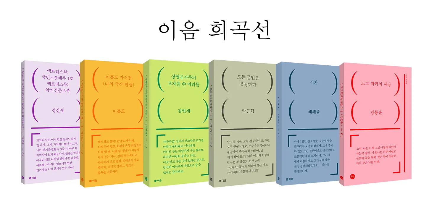 이음이 가지고 있는 예술에 대한 오래된 관심의 한 줄기는 20권이 넘게 출간된 <이음희곡선>입니다. 지금은 없어진 남산예술극장과의 협업으로 탄생한 이 시리즈는 국립극단, 두산아트센터 등과의 협력을 이어가면서 실제로 무대에 올라간 작품들을 책으로 만들고 있습니다.